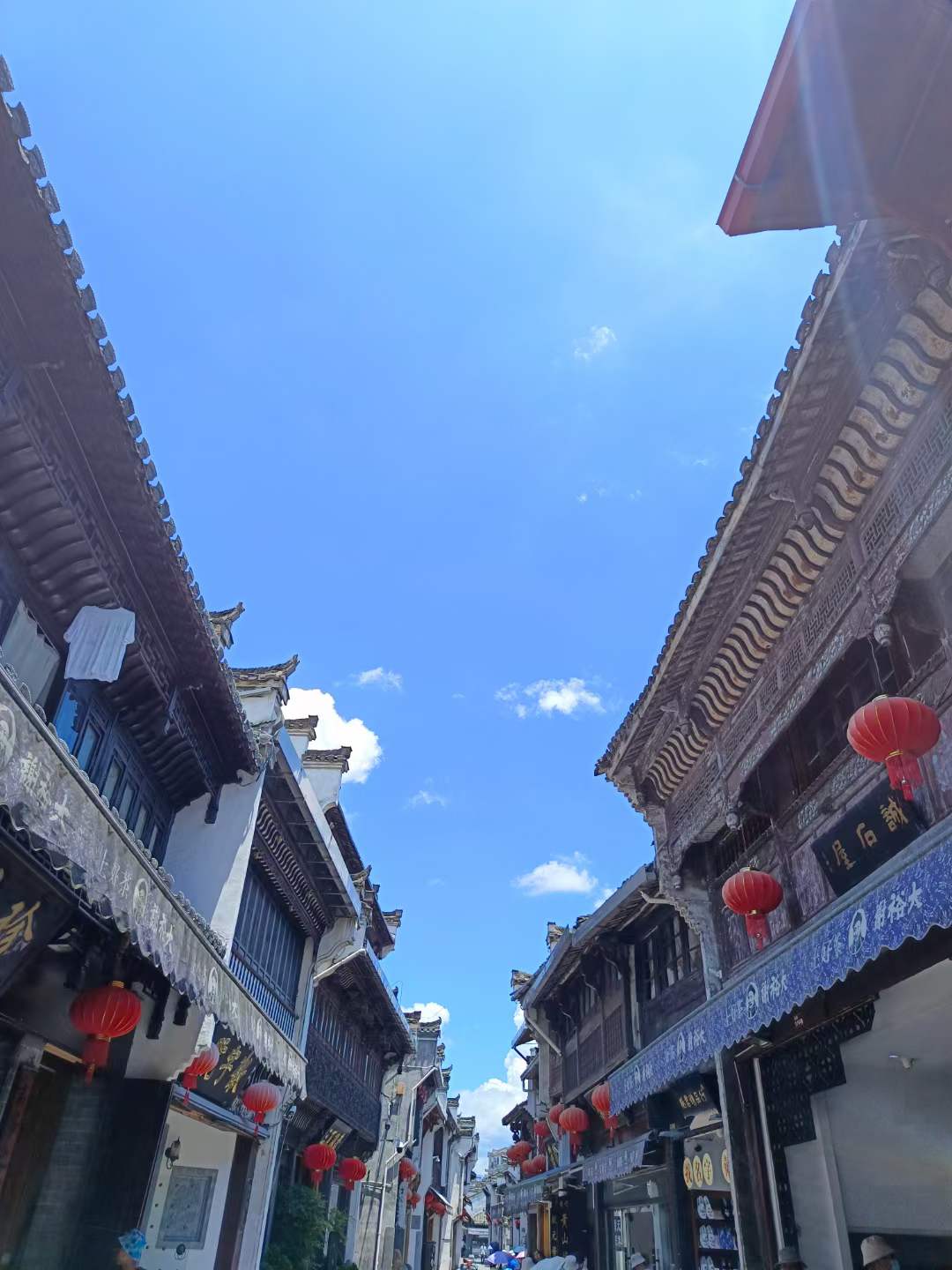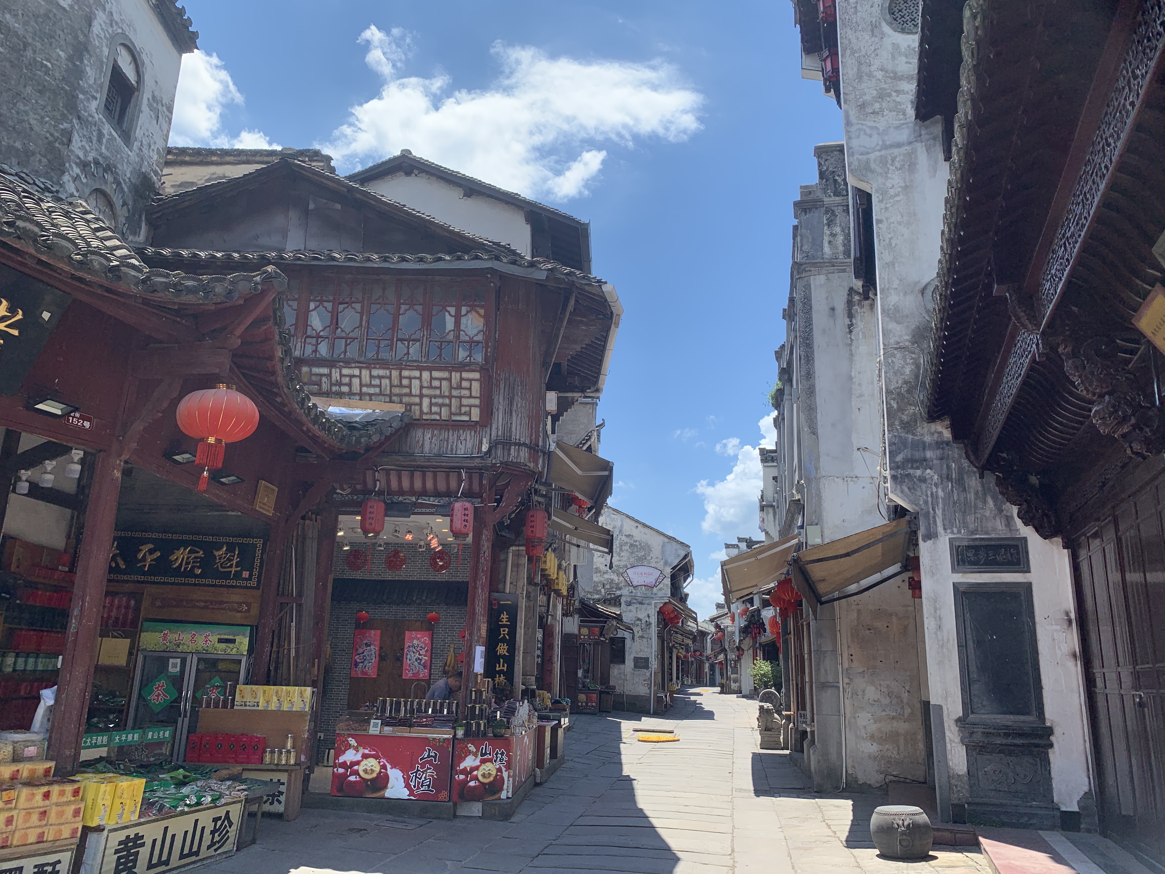 經(jīng)過3個多小時的車程,我們首先來到的是屯溪老街。屯溪老街座落在安徽省黃山市屯溪區(qū)中心地段,北面依山,南面傍水,全長1272米,由不同年代建成的300余幢徽派建筑構(gòu)成的整個街巷,呈魚骨架形分布,西部狹窄、東部較寬。因屯溪老街坐落在橫江、率水和新安江三江匯流之處,所以又被稱為流動的"清明上河圖",是中國保存最完整、最具有南宋和明清建筑風格的古代街市,也是中國"全國重點文物保護單位"。
